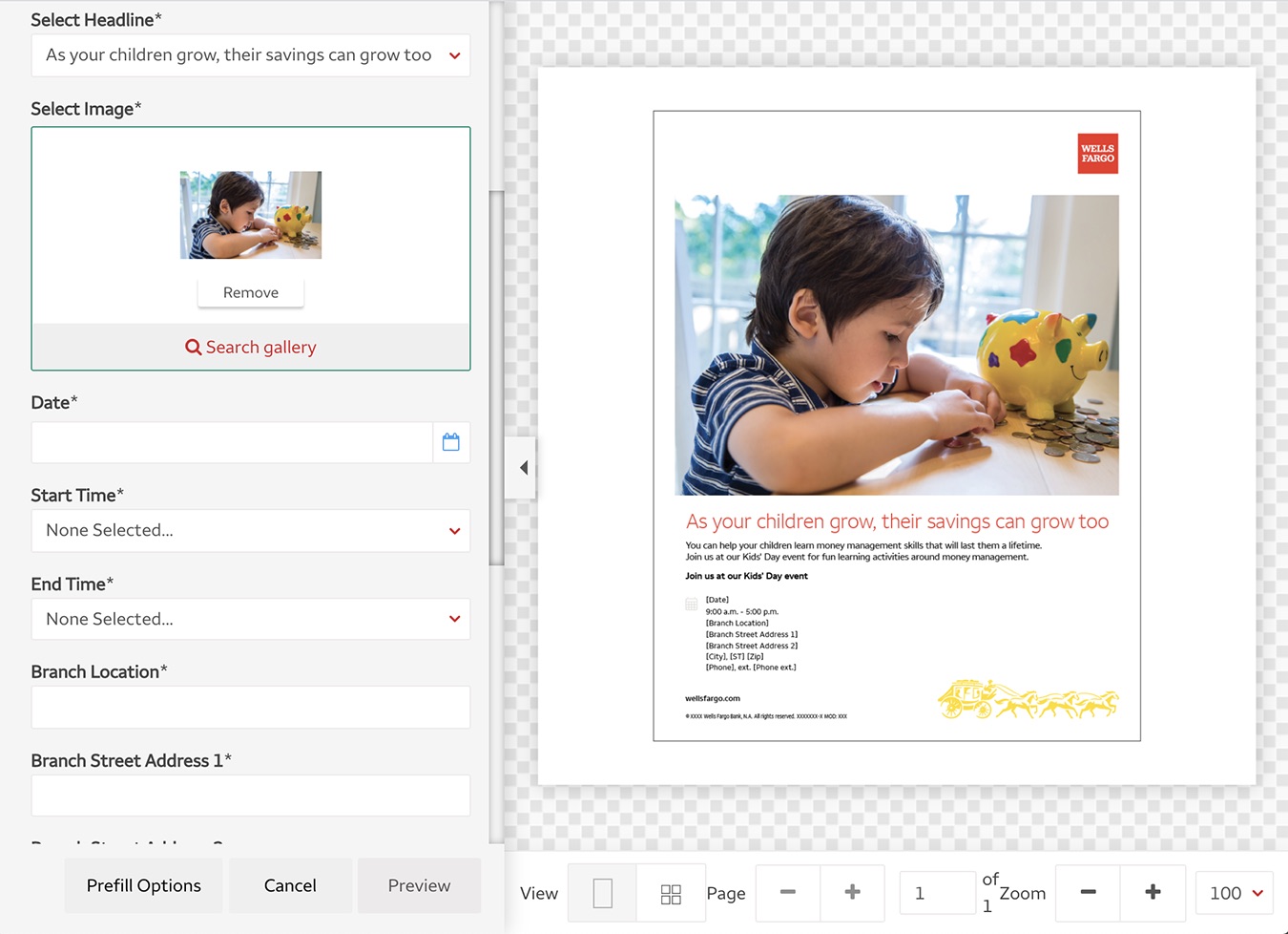 The Wells Fargo Marketing on Demand (MOD) program is an initiative to automate the creation and customization of print and digital marketing materials — increasing efficiency and speed to market. Managing products from prototyping to production, we designed pattern-based layout templates and built the products in a dynamic customization proprietary software. Users are able to create customized marketing pieces by swapping out images, headlines, content, CTAs, event details, contact information, and even adjust the final download size to perfectly match their production specs.